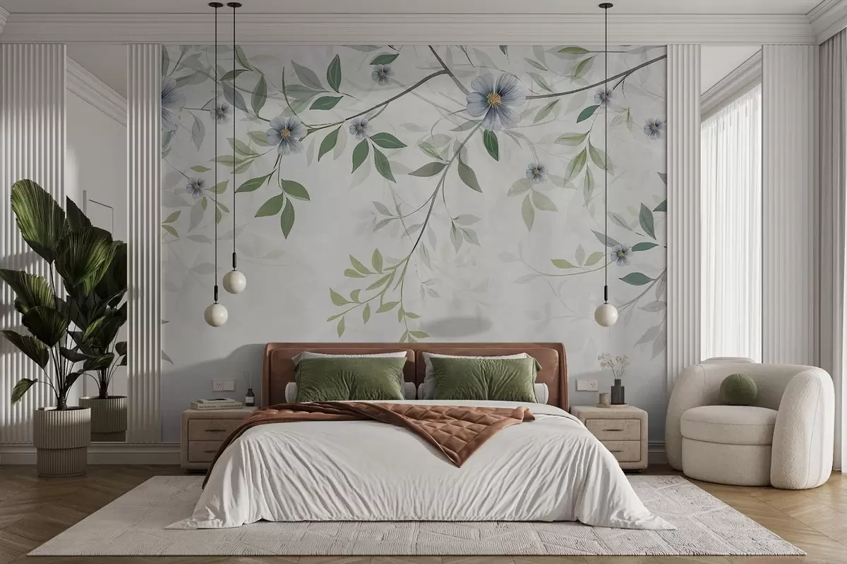 Τοιχογραφίες Κλαδιά με πράσινα φύλλα και μπλε λουλούδια Nr. w00316