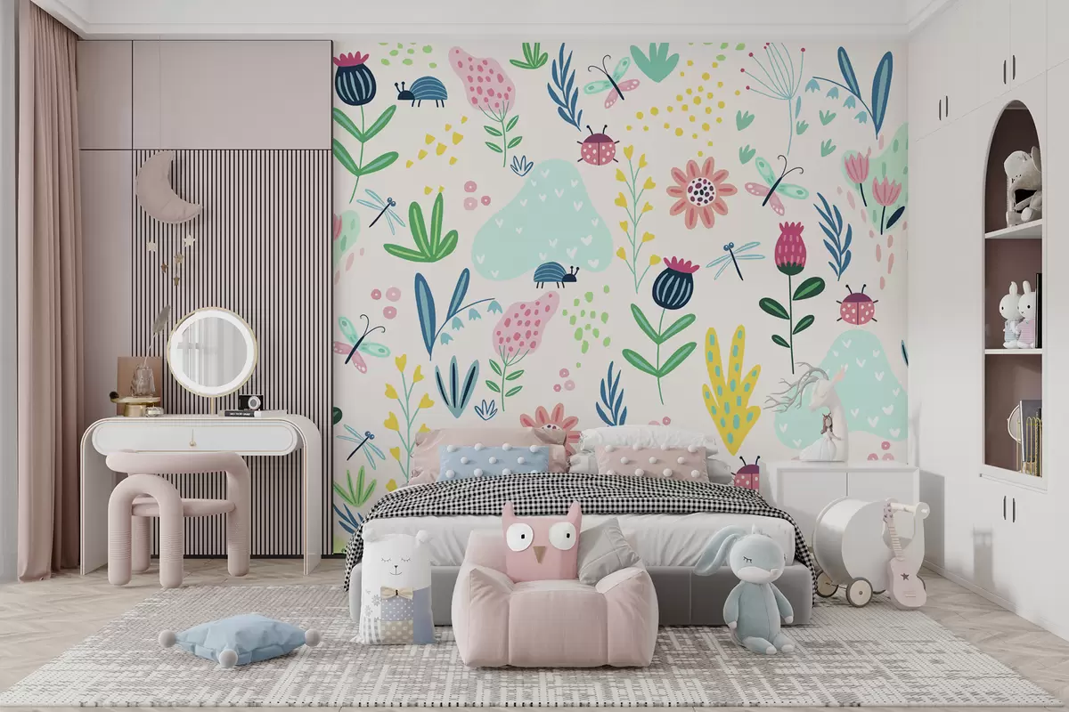 Τοιχογραφίες λουλούδια, πεταλούδες, λιβελλούλες, πασχαλίτσες, βρεφικό δωμάτιο Nr. w00554
