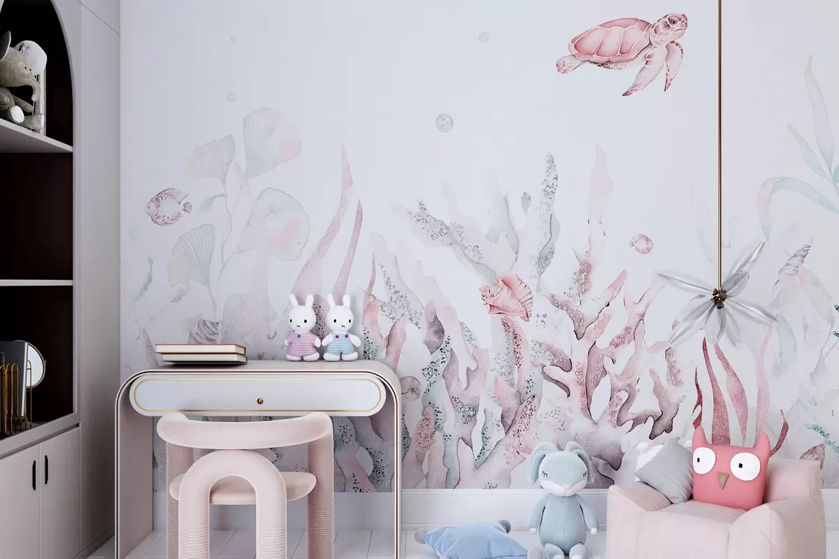 Τοιχογραφίες Ακουαρέλα θαλάσσια κοράλλια, κοχύλια, χελώνα, θαλάσσια ζωή, απαλά ροζ χρώματα Nr. w00849v2