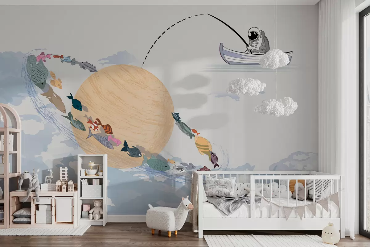 Τοιχογραφίες Φεγγάρι και ψάρια αστροναυτών στο μπλε Nr. w00869