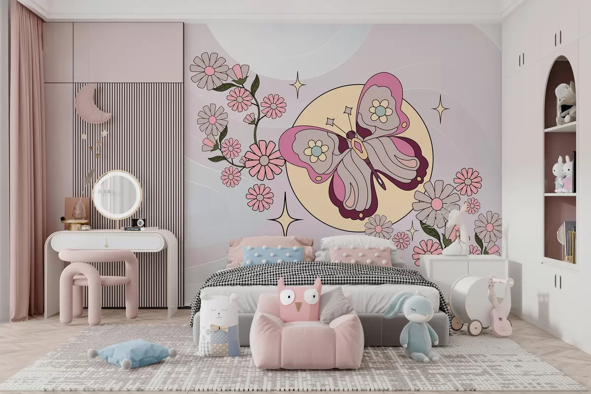 Τοιχογραφίες ταπετσαρία με ροζ πεταλούδα σε ανοιχτό γκρι-ροζ φόντο ανάμεσα σε λουλούδια σε απλό στυλ για το δωμάτιο ενός κοριτσιού Nr. w00985