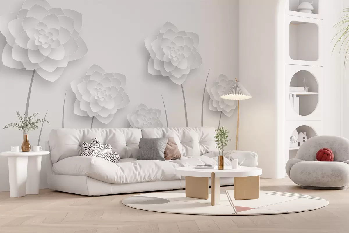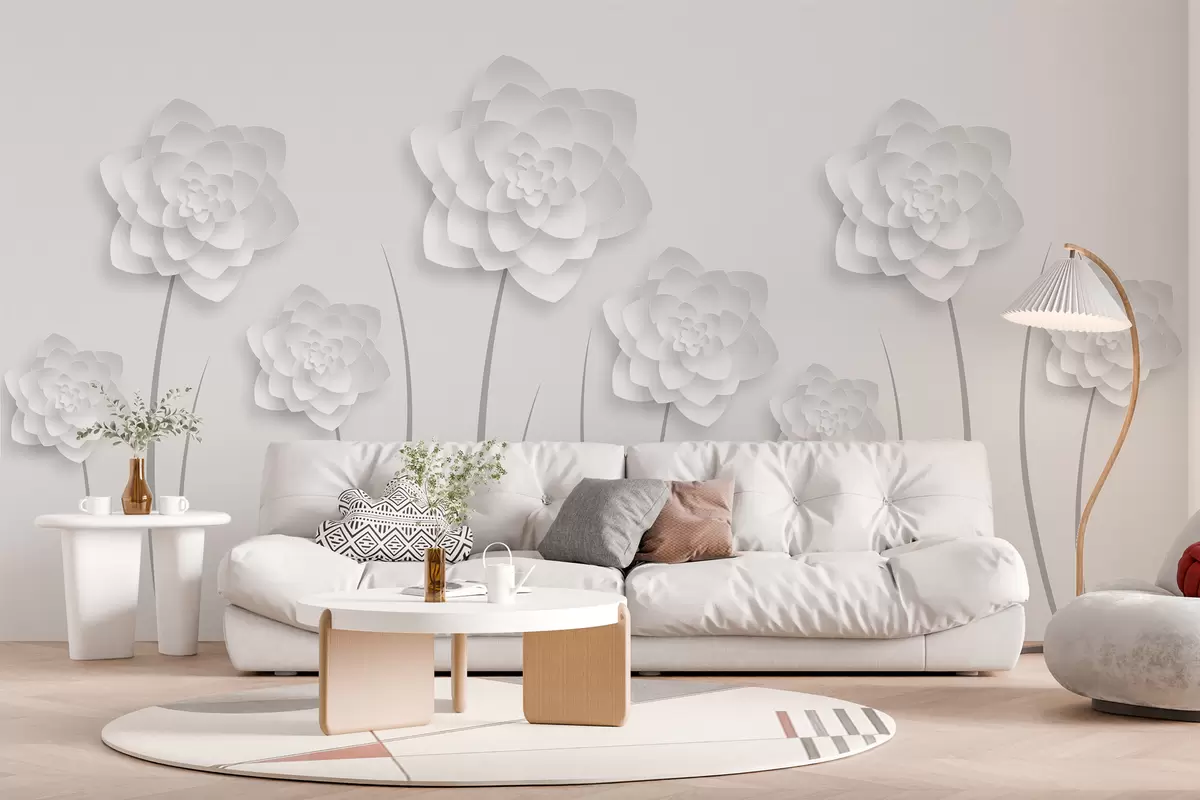 Τοιχογραφίες Μεγάλα λουλούδια με απομίμηση όγκου σε στυλ χαρτιού σε ανοιχτό γκρι φόντο με γκρι μίσχο Nr. w01021