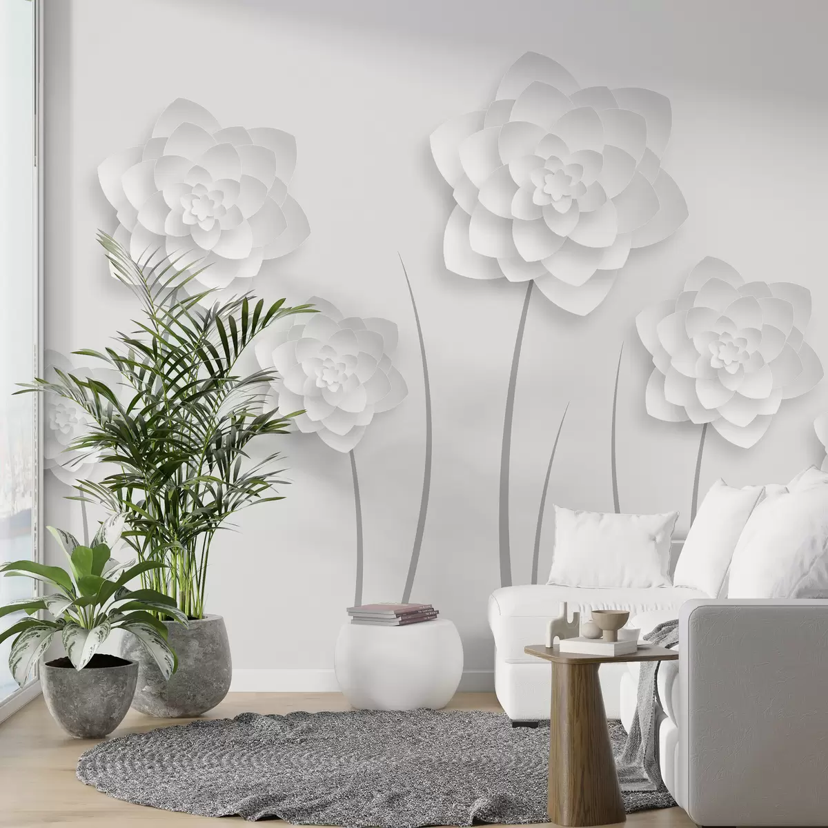 Τοιχογραφίες Μεγάλα λουλούδια με απομίμηση όγκου σε στυλ χαρτιού σε ανοιχτό γκρι φόντο με γκρι μίσχο Nr. w01021