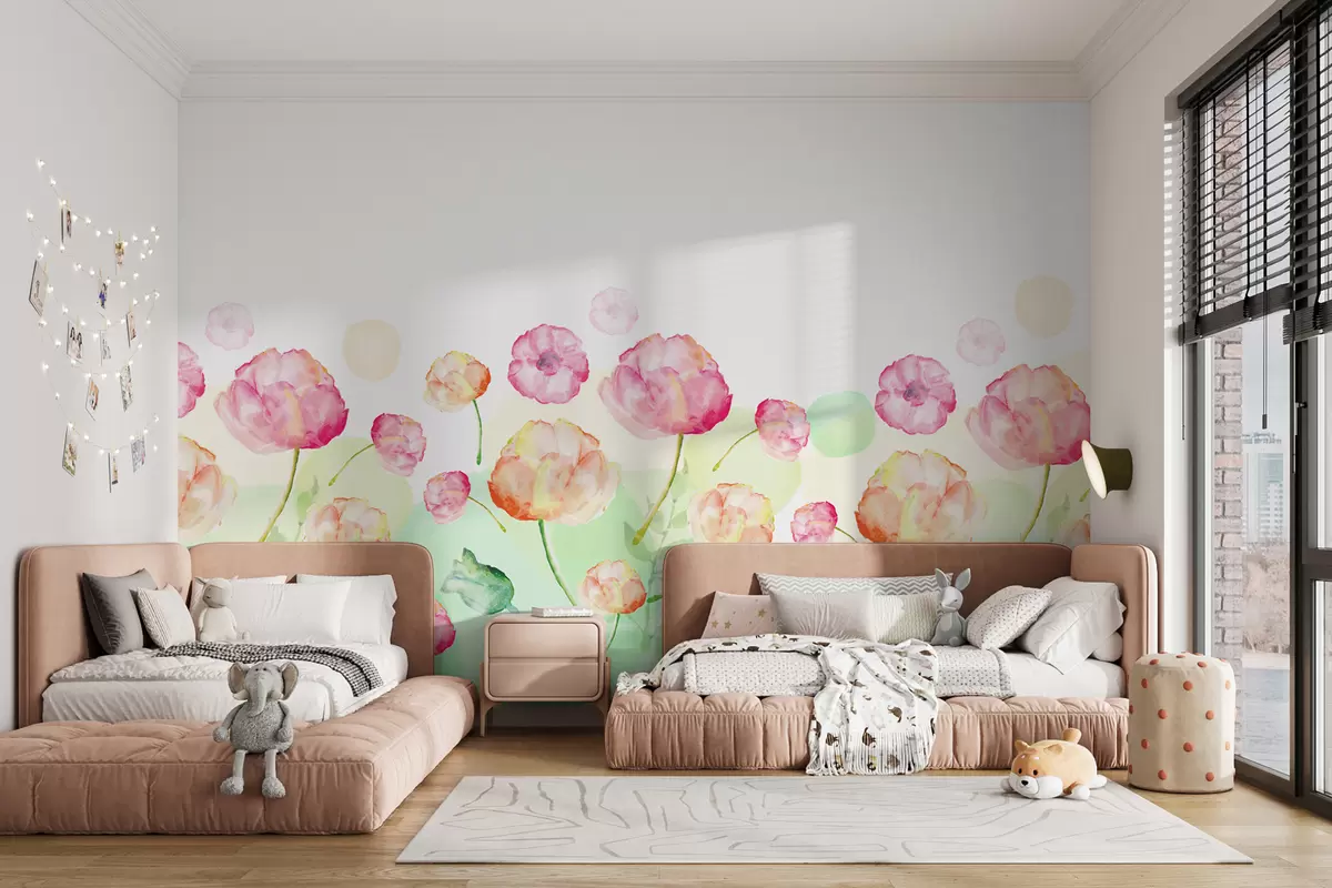Τοιχογραφίες κόκκινο-πορτοκαλί και ροζ τουλίπες σε τεχνική ακουαρέλας σε λευκό φόντο με πράσινους λεκέδες Nr. w01028