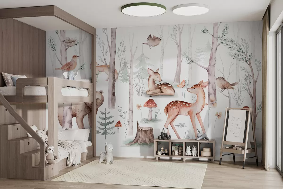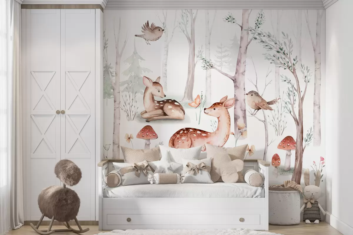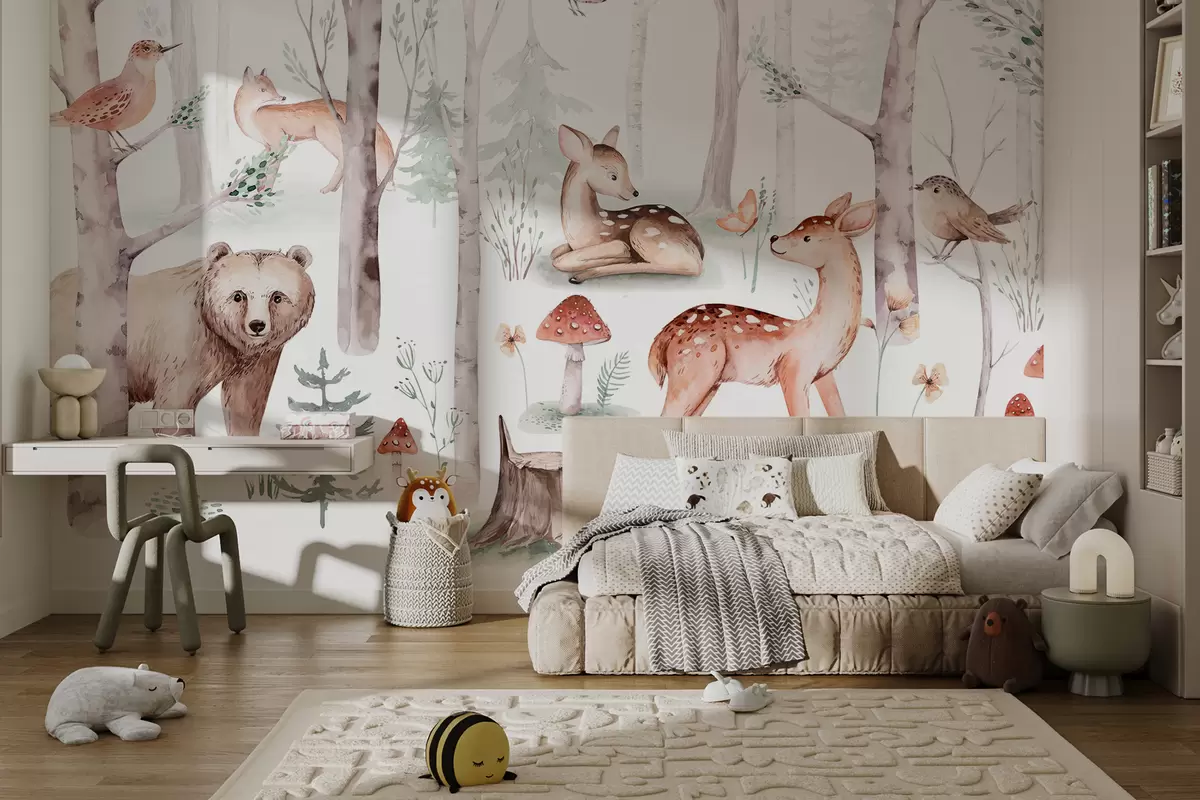 Τοιχογραφίες Ταπετσαρία για το παιδικό δωμάτιο, ζώα του δάσους. Λεπτή ταπετσαρία σε στυλ ακουαρέλας σε ευχάριστα ζεστά παστέλ χρώματα σε λευκό φόντο Nr. w01089