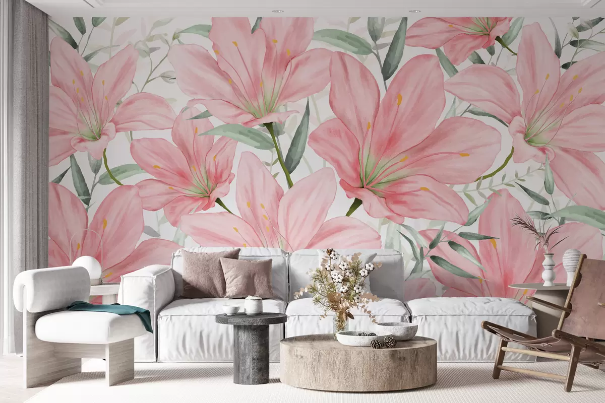Τοιχογραφίες Μεγάλα ανοιχτό ροζ κρίνα και φύλλα σε στυλ ακουαρέλας σε λευκό φόντο Nr. w01121