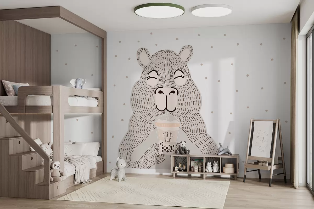 Τοιχογραφίες Μεγάλο χαριτωμένο μπεζ capybara με φούσκα σε μινιμαλιστικό στυλ παύλας σε λευκό διάστικτο φόντο Nr. w01122