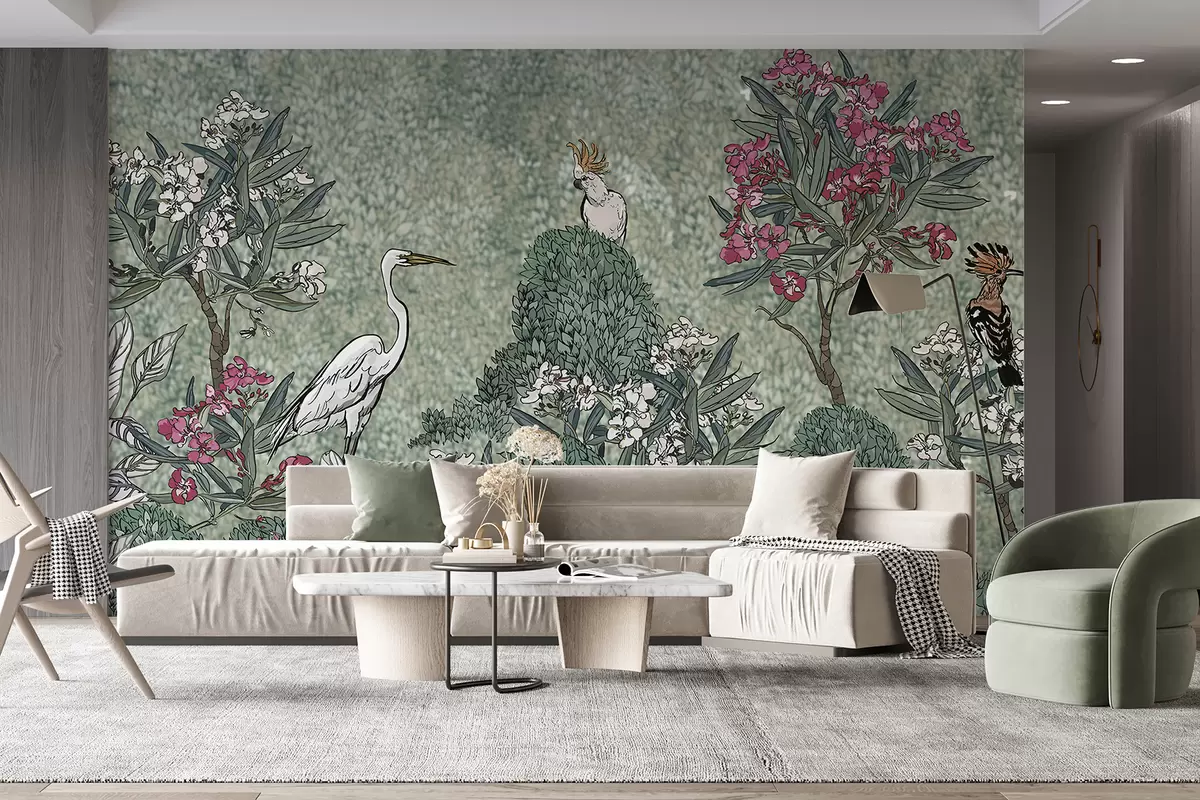 Τοιχογραφίες Μια πλούσια, τροπική σκηνή με έναν λευκό ερωδιό, ένα μαύρο πουλί και ροζ λουλούδια σε φόντο πράσινου φυλλώματος Nr. w01242