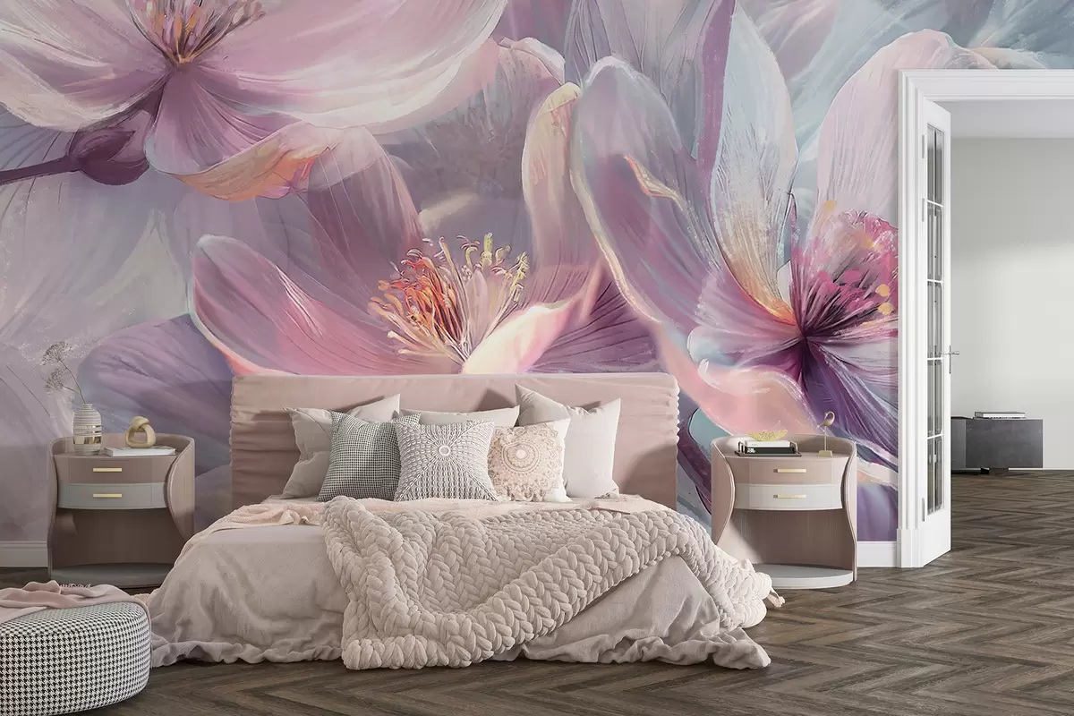 Τοιχογραφίες Λεπτά διαφανή παστέλ νέον ανοιχτό ροζ και λευκά λουλούδια με απαλό, θολό φόντο Nr. w01307