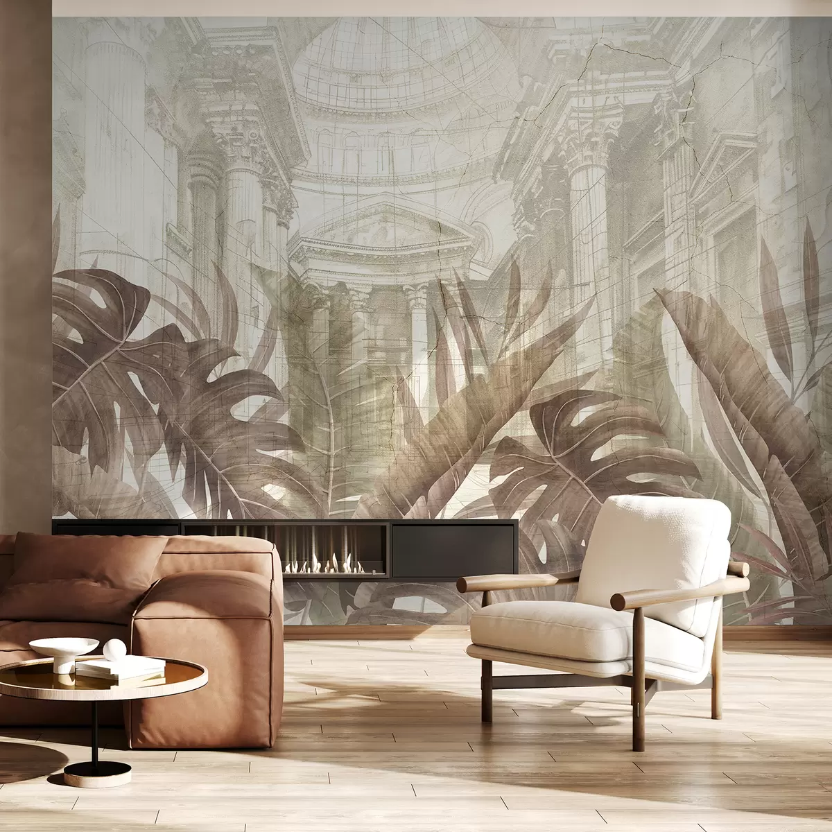 Τοιχογραφίες Ένα μεγάλο σχέδιο περίτεχνες αρχιτεκτονικές μαρμάρινες στήλες και πλούσια τροπικά φυτά σέπια Nr. w01311v1
