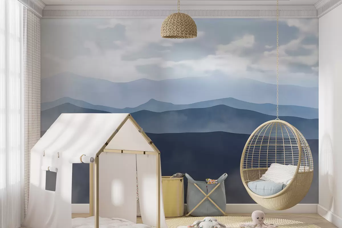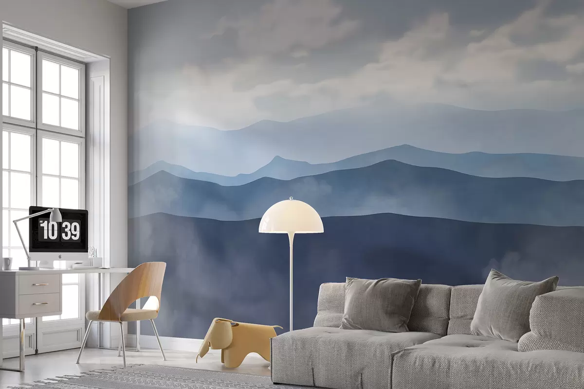 Τοιχογραφίες Ομίχλη ορεινό τοπίο μινιμαλισμού με κυματιστούς λόφους και συννεφιασμένο ουρανό Nr. w01317