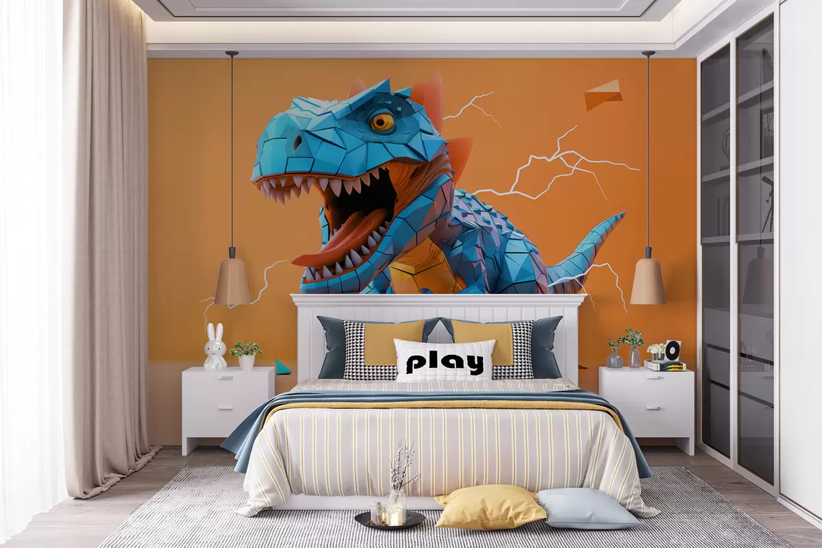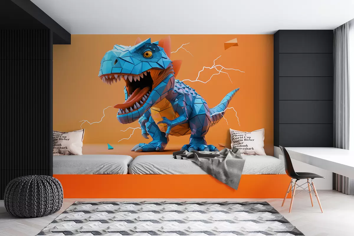 Τοιχογραφίες Άγριος δεινόσαυρος με κεραυνό σε κίτρινα και μπλε χρώματα Nr. w01333v1