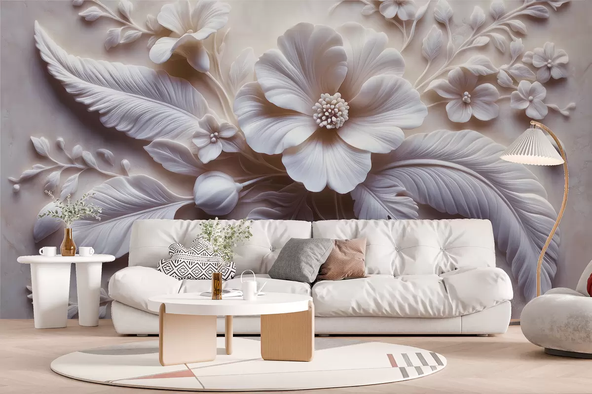 Τοιχογραφίες τρισδιάστατη ανάγλυφη τέχνη τοίχου με φτερά και λουλούδια, με μια μεγάλη παπαρούνα σε ανοιχτό ροζ χρώματα Nr. w01340v1