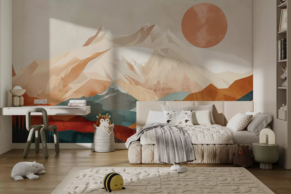 Τοιχογραφίες Boho bliss: ένα γαλήνιο τοπίο με βουνά, δέντρα και ήλιο Nr. w01358