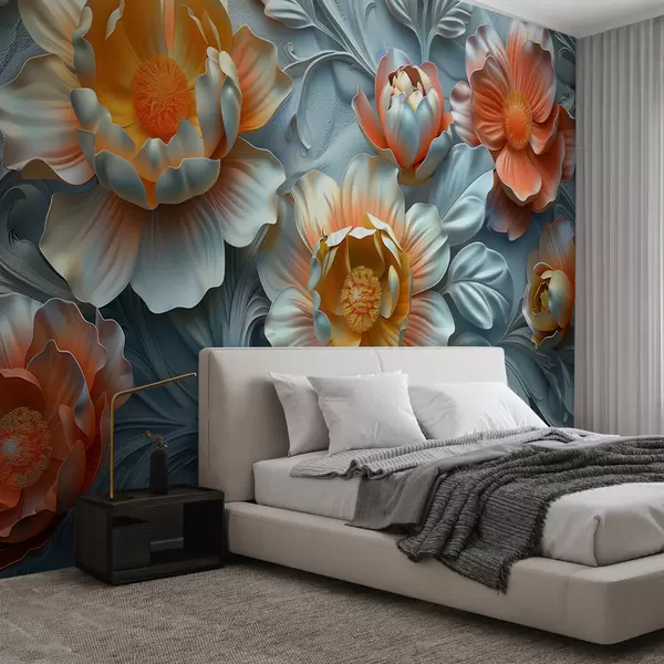 Τοιχογραφίες 3D απεικόνιση των αφηρημένων φωτεινών λουλουδιών σε στυλ μπαρόκ σε φυτικό φόντο Nr. w01427