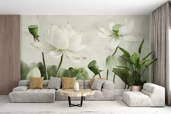 Τοιχογραφίες Άνθη λωτού, ακουαρέλα, φύση, λουλουδάτη σύνθεση, μεγάλα φύλλα, απαλά πράσινα χρώματα Nr. w01445v2