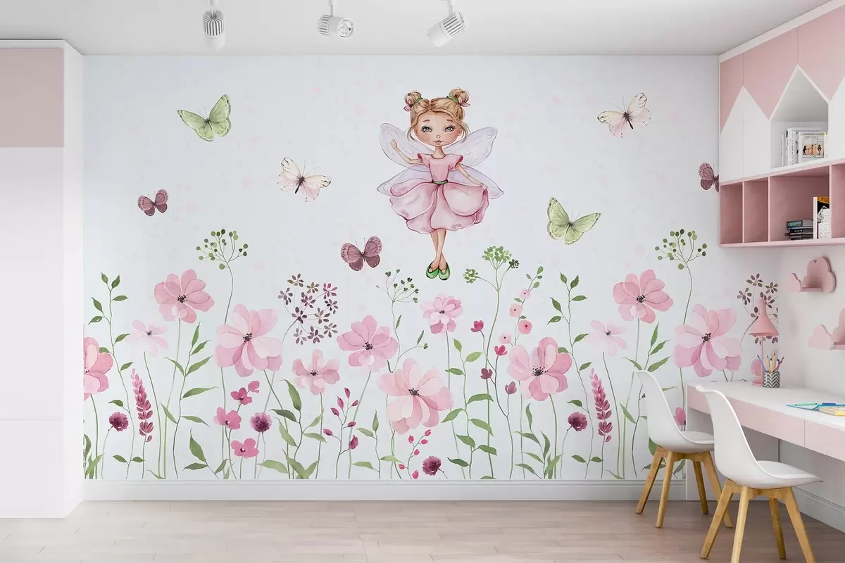 Τοιχογραφίες Μια νεράιδα ανάμεσα σε λουλούδια και πεταλούδες Nr. w01460