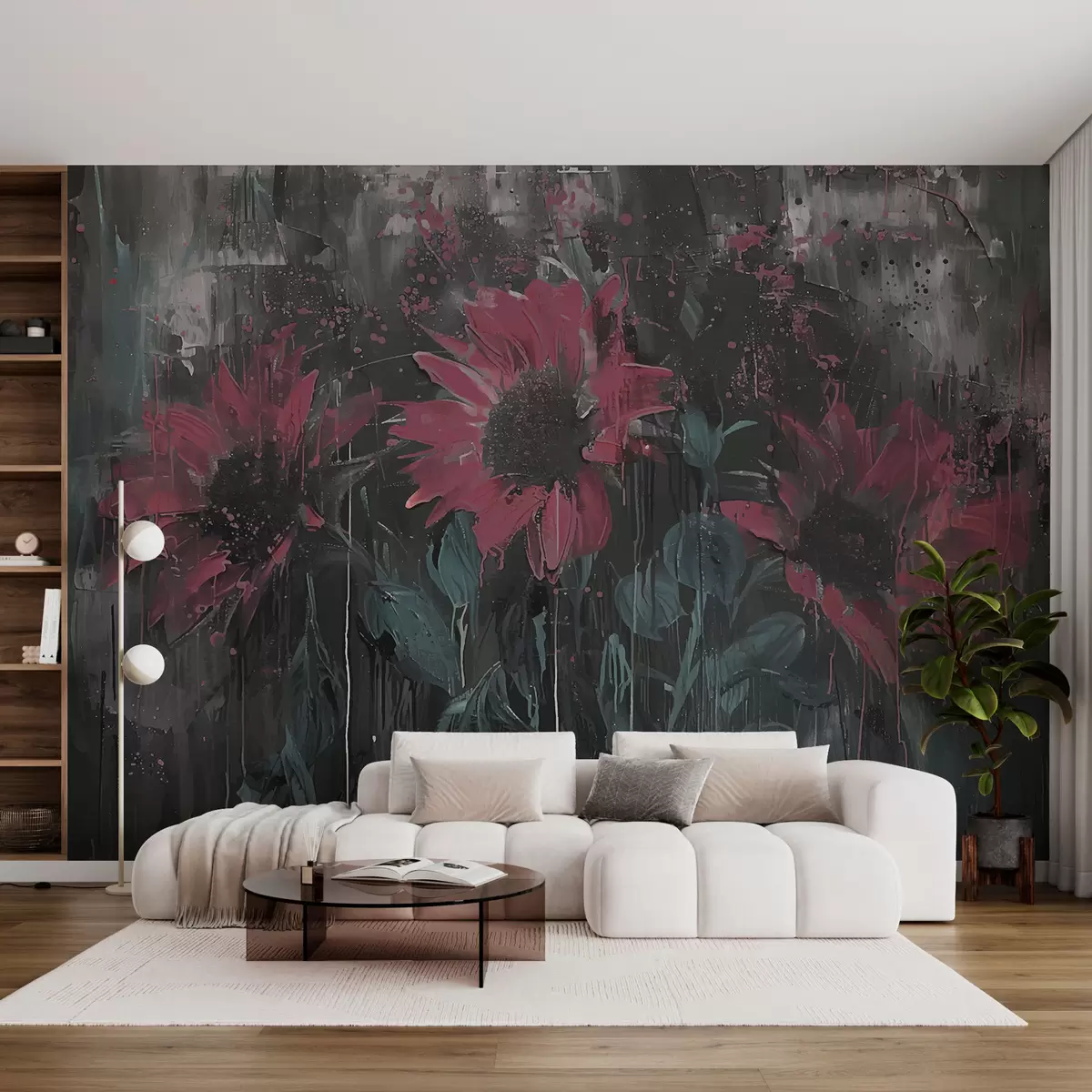 Τοιχογραφίες Αφηρημένη εικόνα ηλίανθου, σκούρο γκρι φόντο και κόκκινο-ροζ τόνους Nr. w01480v1