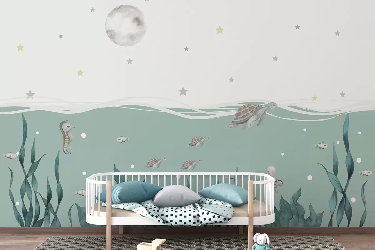 Τοιχογραφίες Θαλασσινό μοτίβο με χελώνες, ιππόκαμπο, ψάρια και πανσέληνο Nr. w01521