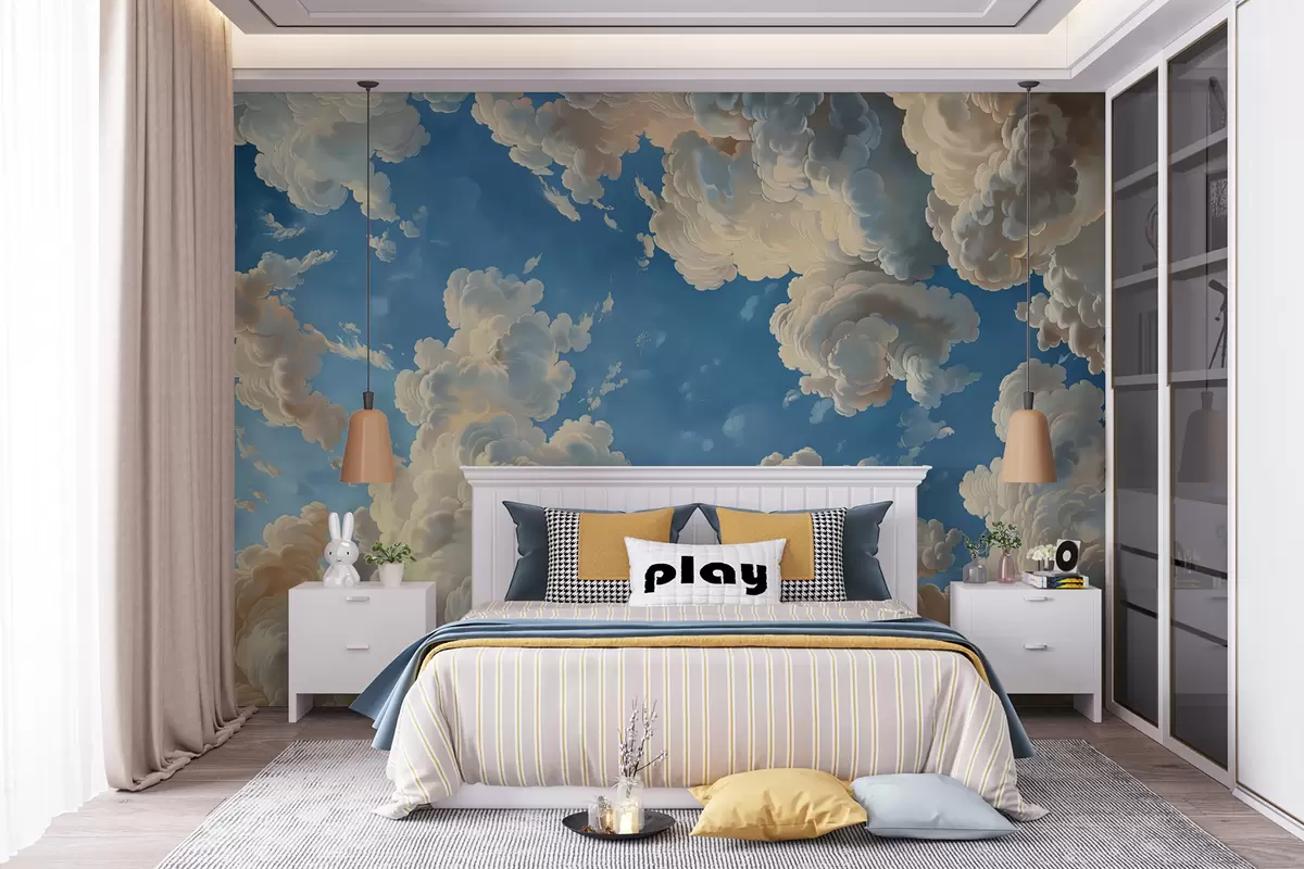Τοιχογραφίες Φουσκωτά σύννεφα σε ζεστούς τόνους του κρεμ, του απαλού ροδακινί και του χλωμού , σε συνδυασμό με έναν βαθύ, ζωντανό μπλε ουρανό Nr. w01583