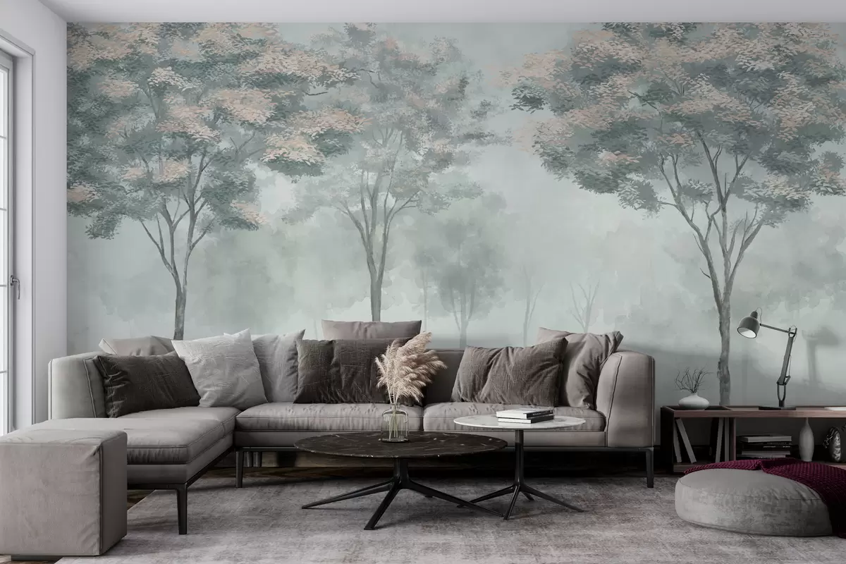 Τοιχογραφίες Ομίχλη του δάσους σε πράσινο, ανοιχτό γκρι και μπεζ χρώμα Nr. w01599