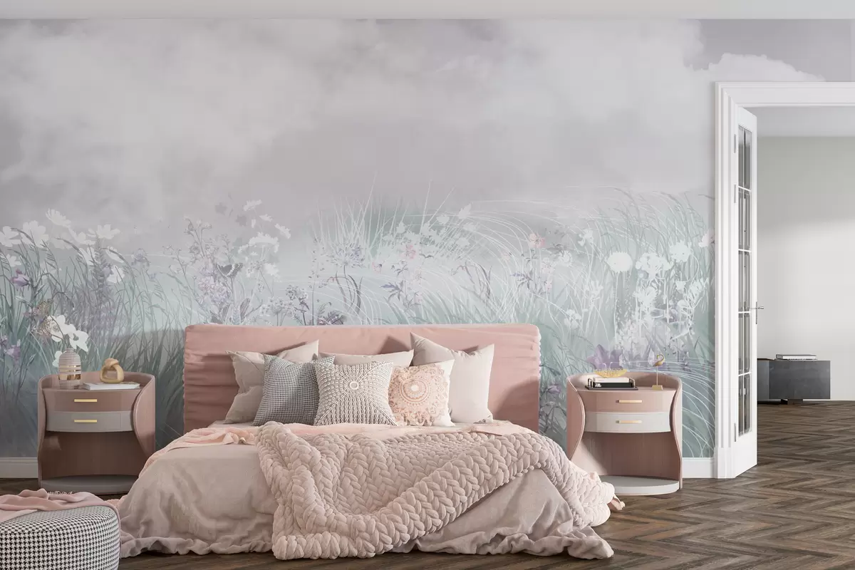 Τοιχογραφίες Αγριολούλουδα και χόρτα με ροζ ουρανό και σύννεφα Nr. w01624v1