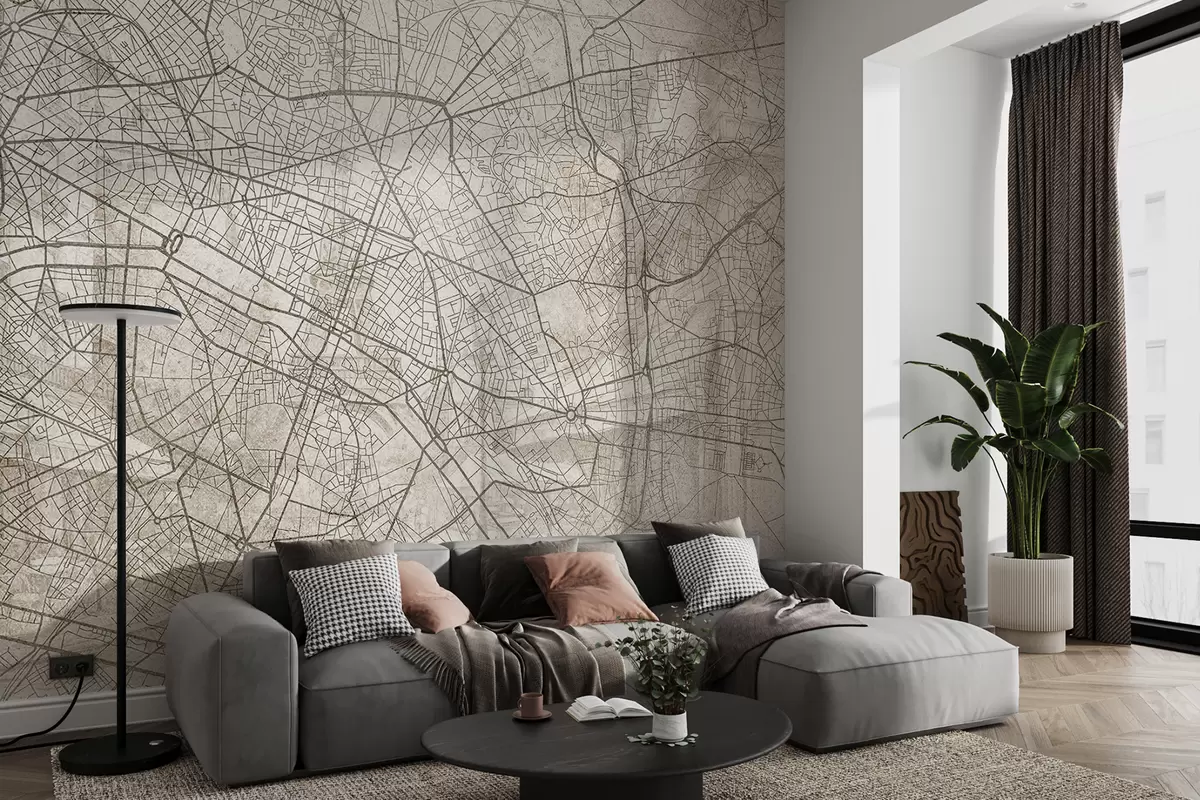 Τοιχογραφίες Χάρτης πόλης Παρίσι, γραμμικό σχέδιο, αρχιτεκτονική, Γαλλία, μπεζ χρώματα Nr. w01697