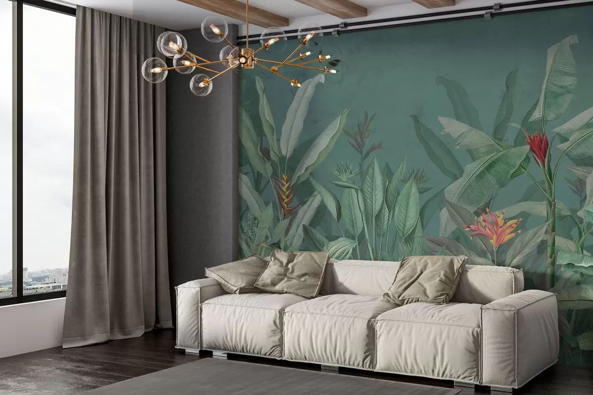 Τοιχογραφίες Τροπικά φύλλα και λουλούδια σε πράσινο φόντο Nr. w01834v2