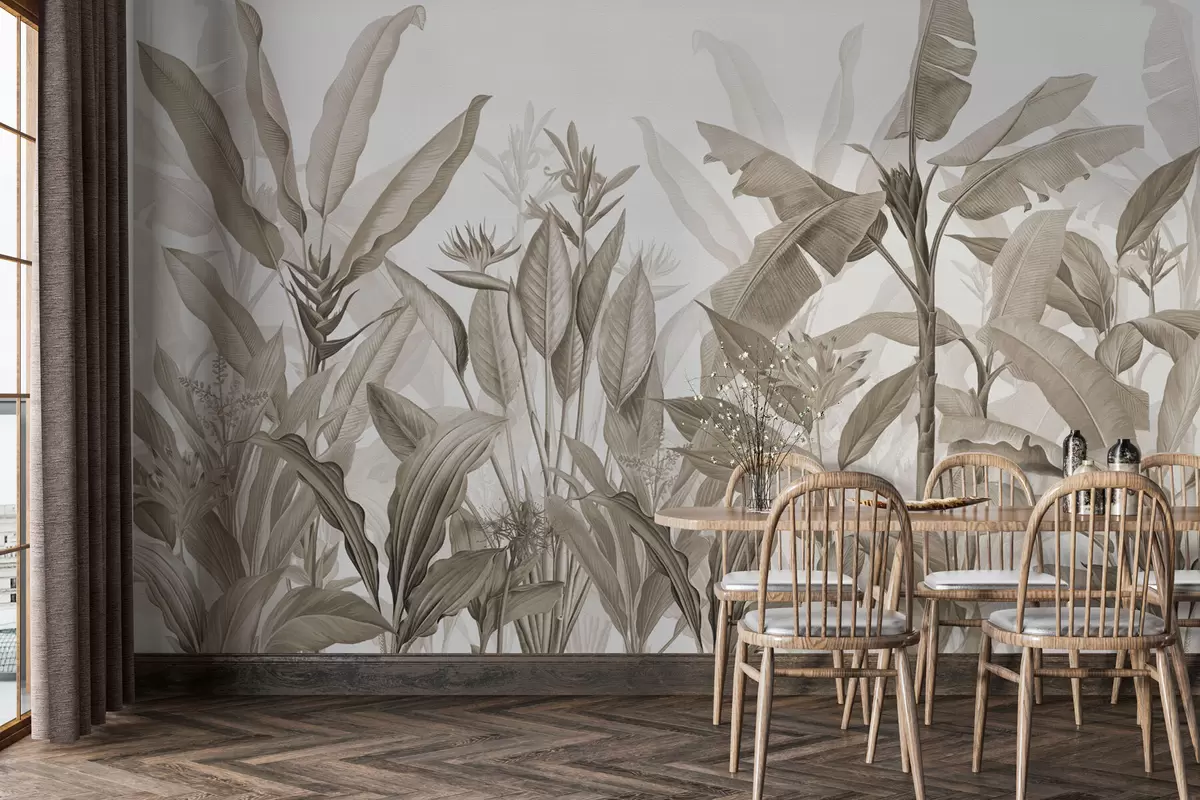 Τοιχογραφίες Τροπικά φύλλα και λουλούδια σε ελαφρύ φόντο σε στυλ σέπια Nr. w01834v4