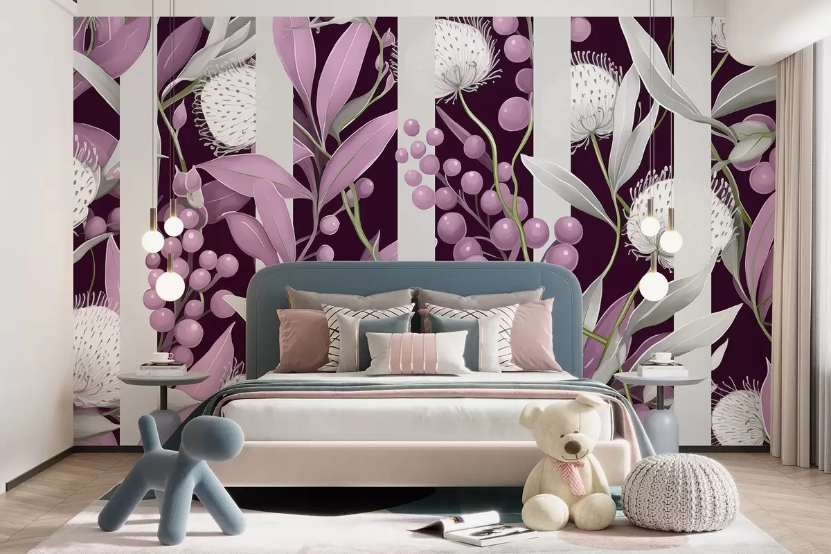Τοιχογραφίες Λουλούδια στολίδι με άγρια μούρα, vintage, ροζ και πράσινα χρώματα Nr. w01886v1