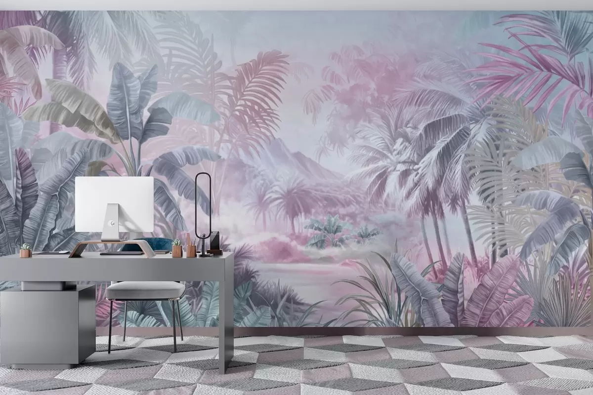 Τοιχογραφίες Τροπικό δάσος σε απαλές μπλε και ροζ αποχρώσεις Nr. w01931v2