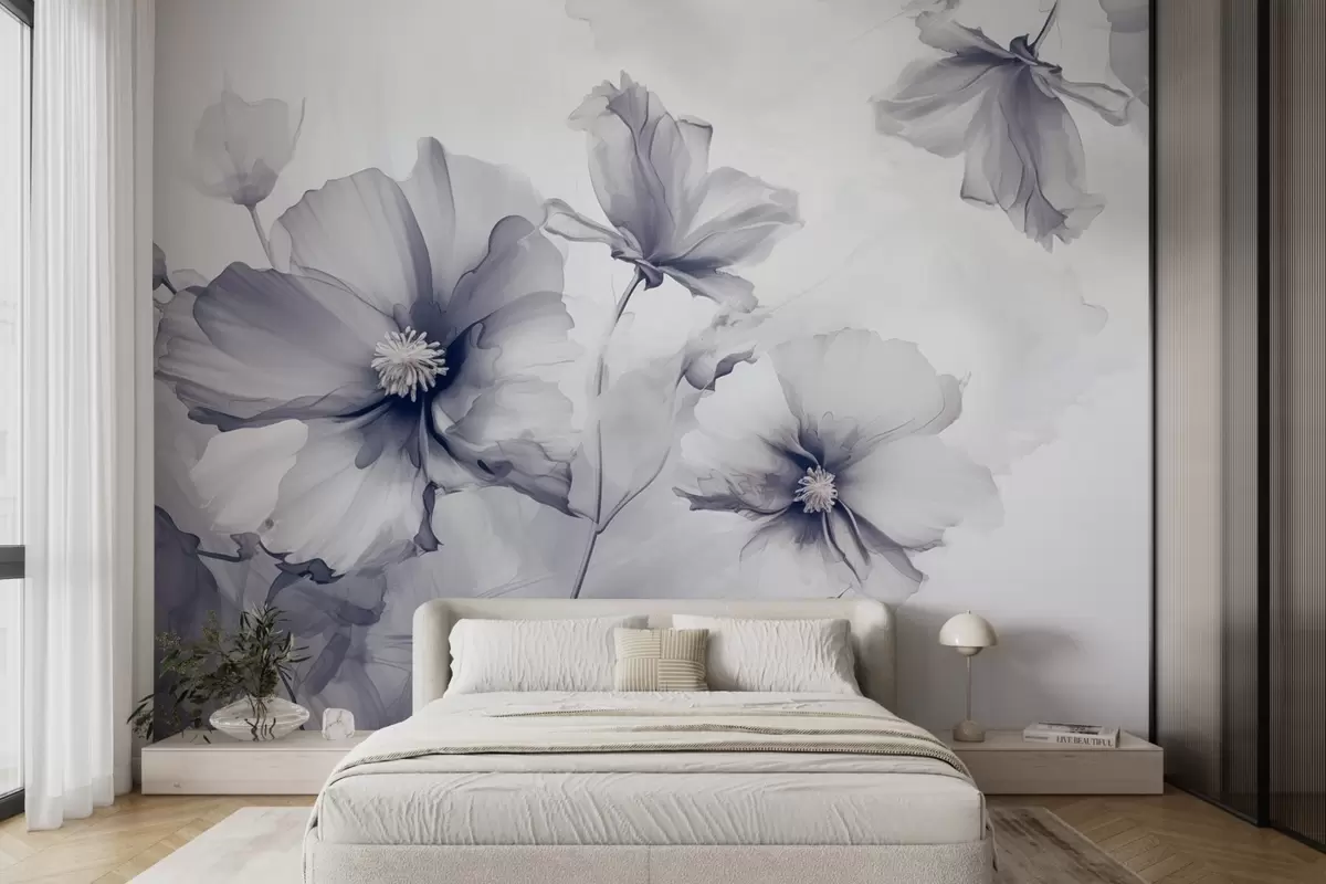 Τοιχογραφίες Αέρινα ημιδιαφανή μπλε λουλούδια που διαλύονται στο πρωινό φως Nr. w01938v2