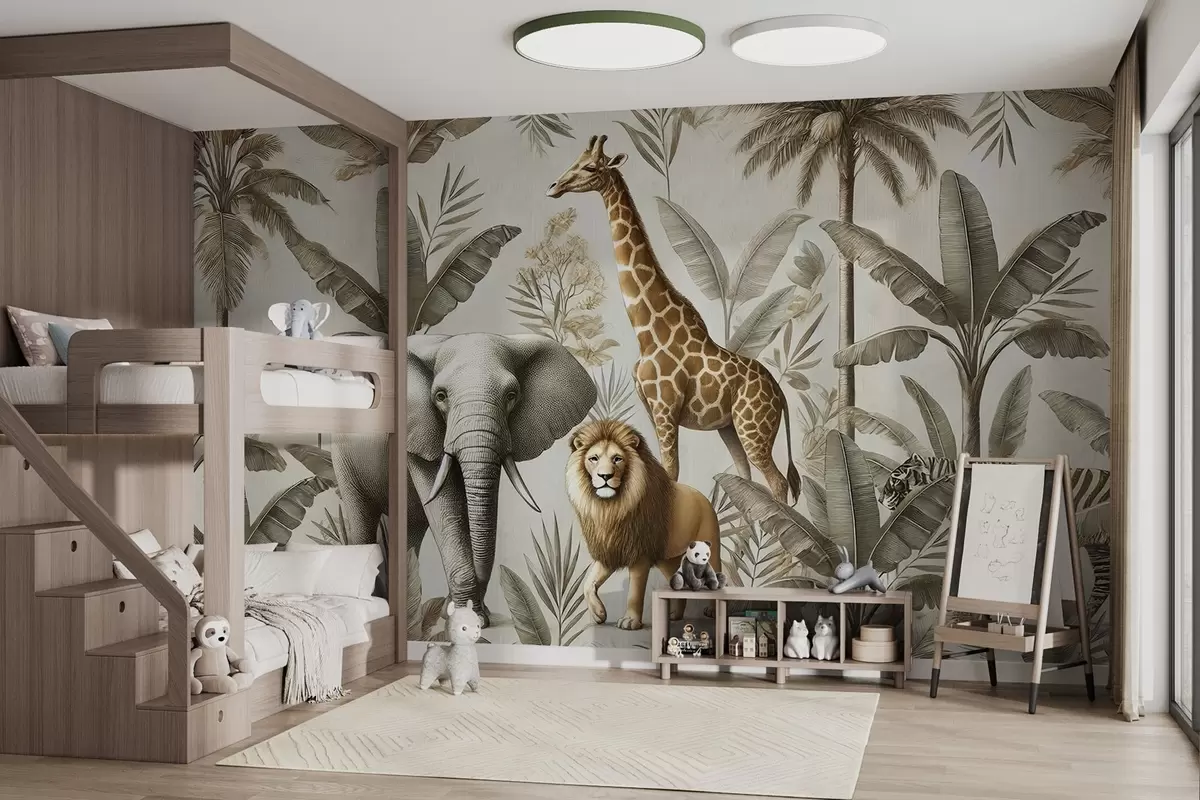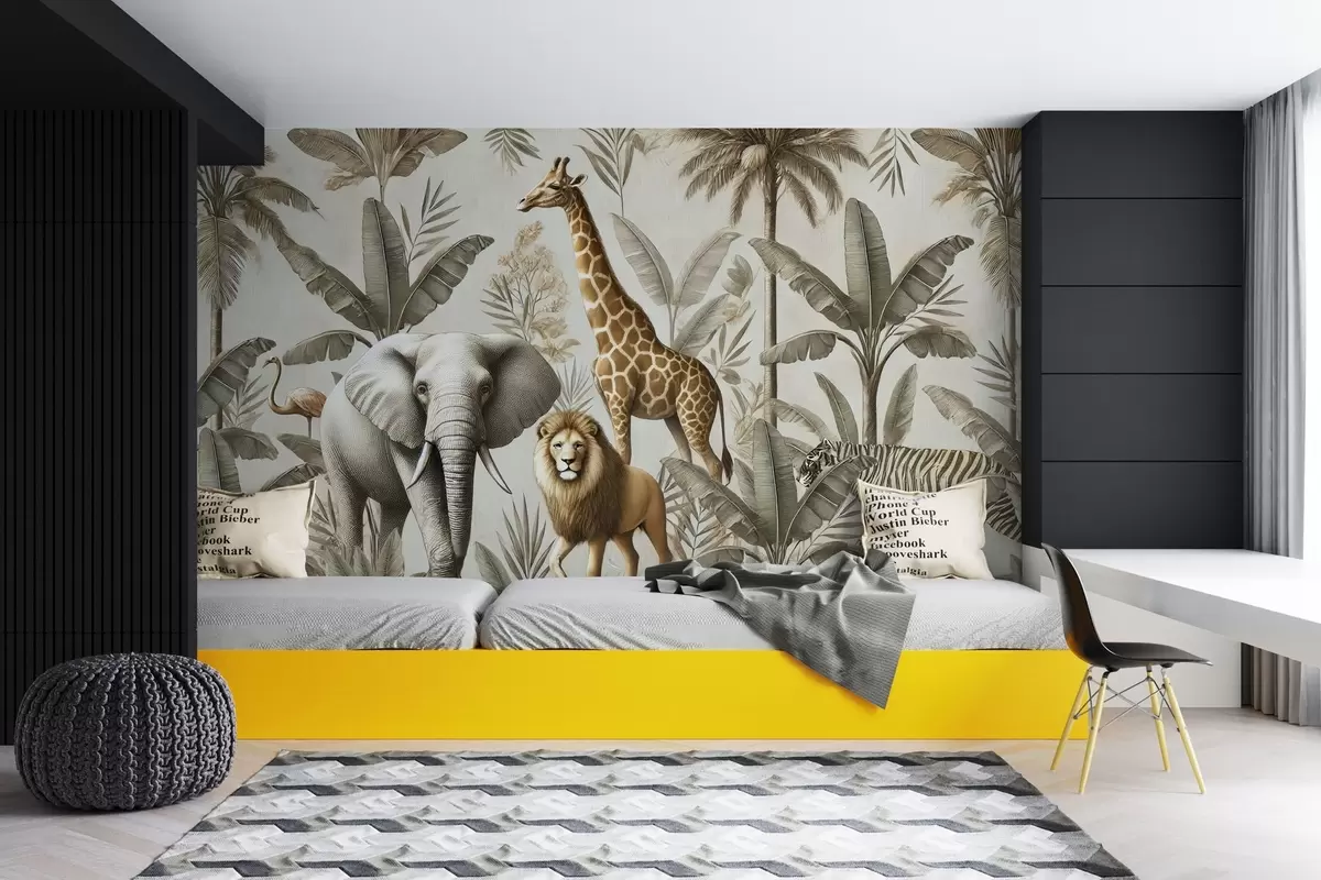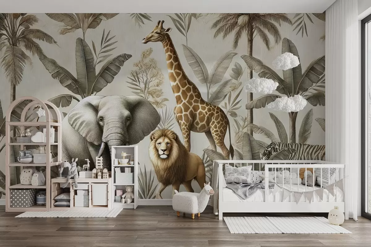 Τοιχογραφίες Παιδική ταπετσαρία Safari με τροπικό τοπίο και διάφορα ζώα σε κομψά χρώματα Nr. w01956