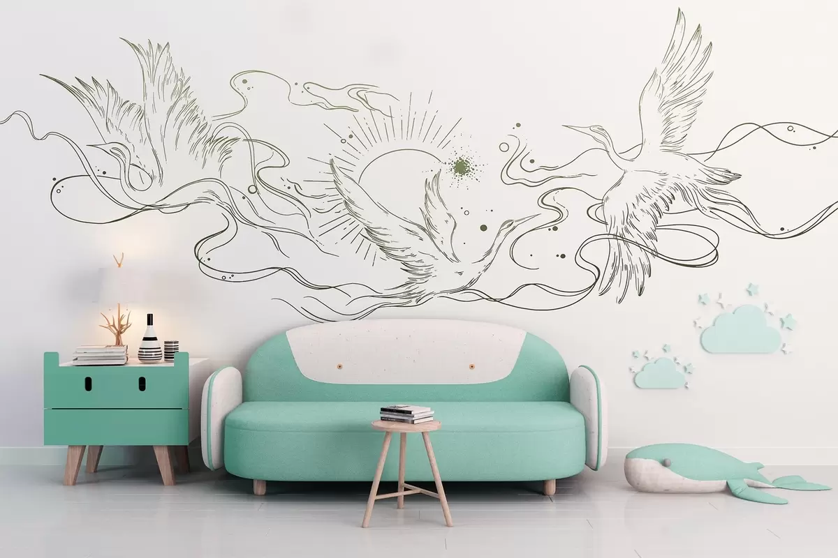 Τοιχογραφίες Ιπτάμενα πουλιά, γραμμικό σχέδιο, μινιμαλισμός, γκρι χρωματική παλέτα Nr. w02022v1