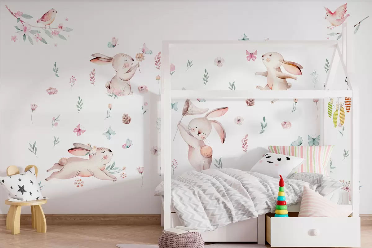 Τοιχογραφίες Παραμυθένια κουνελάκια σε λουλούδια Nr. w02025