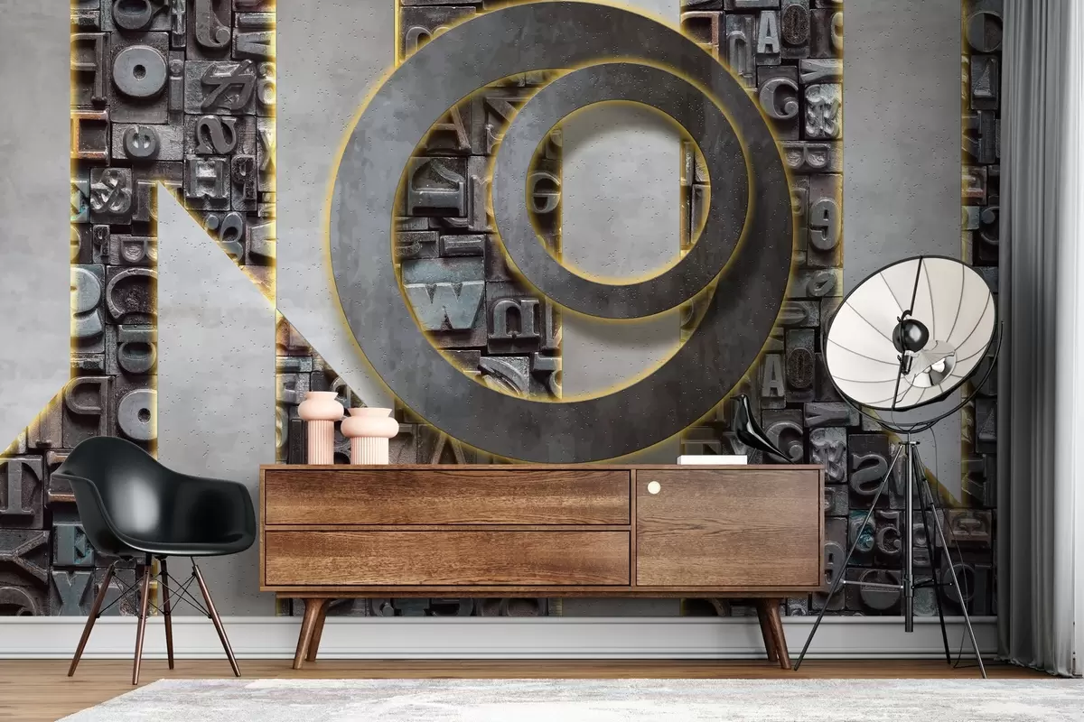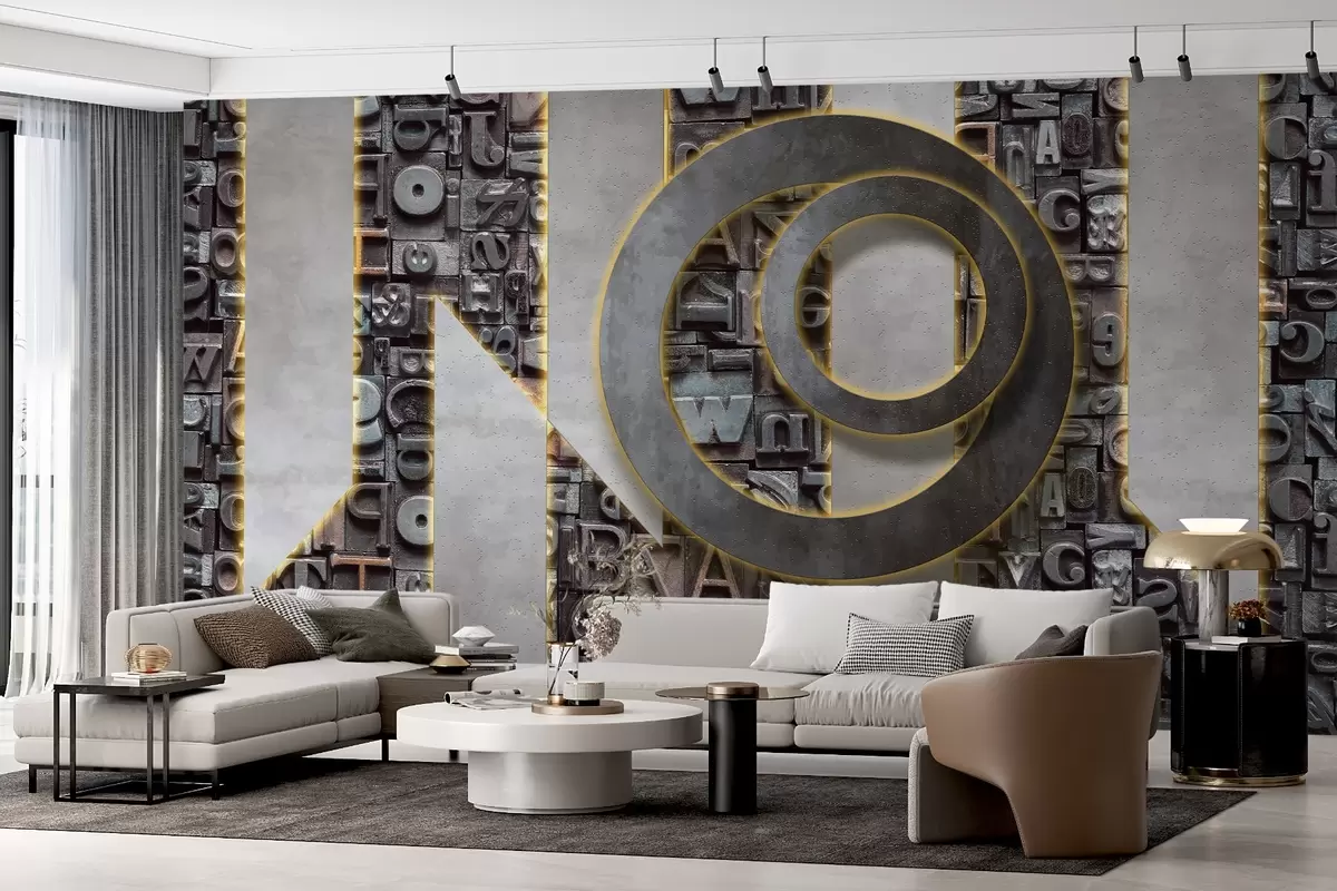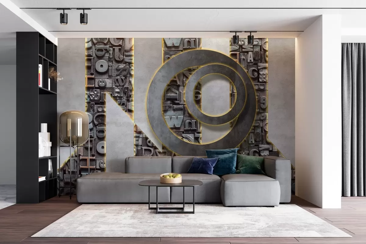 Τοιχογραφίες Μοντέρνα ταπετσαρία σε στυλ loft με απομίμηση τρισδιάστατων γραμμάτων, σκυρόδεμα και οπίσθιο φωτισμό Nr. w02125