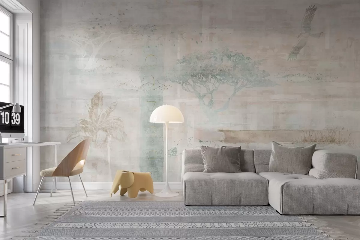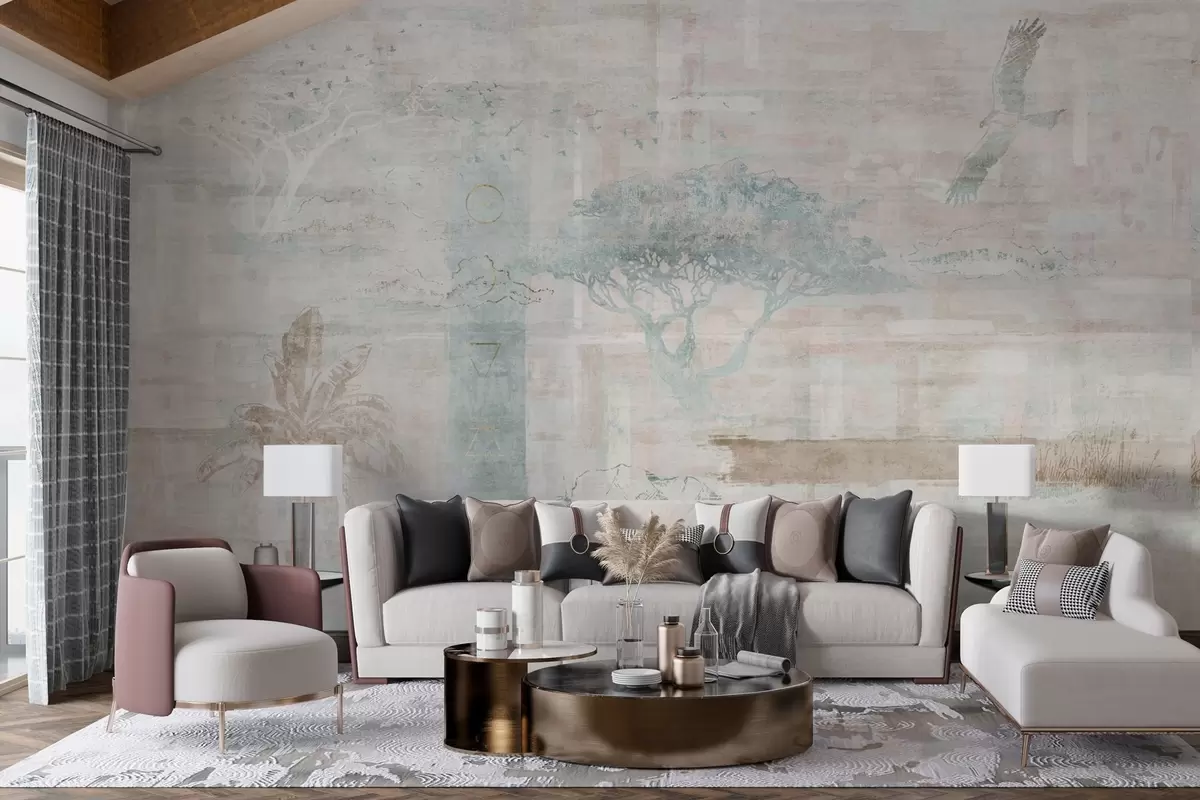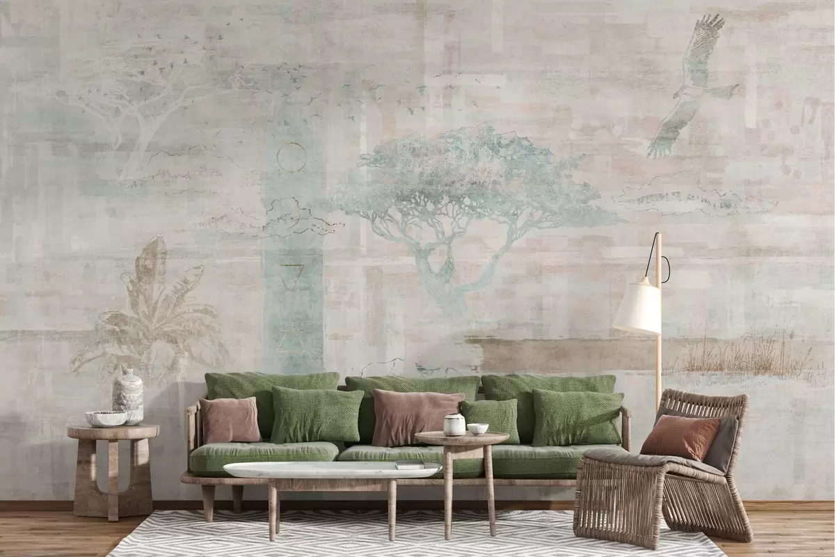 Τοιχογραφίες Vintage grunge σχέδιο με δέντρα, αετό και γεωμετρικά στοιχεία Nr. w02130
