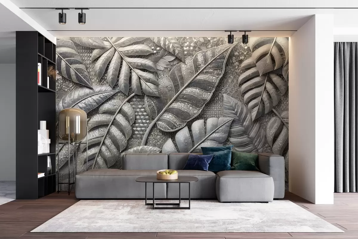 Τοιχογραφίες Μεγάλα τροπικά φύλλα σε λεπτούς ασημένιους τόνους, σε στυλ μωσαϊκού με υφή Nr. w02135
