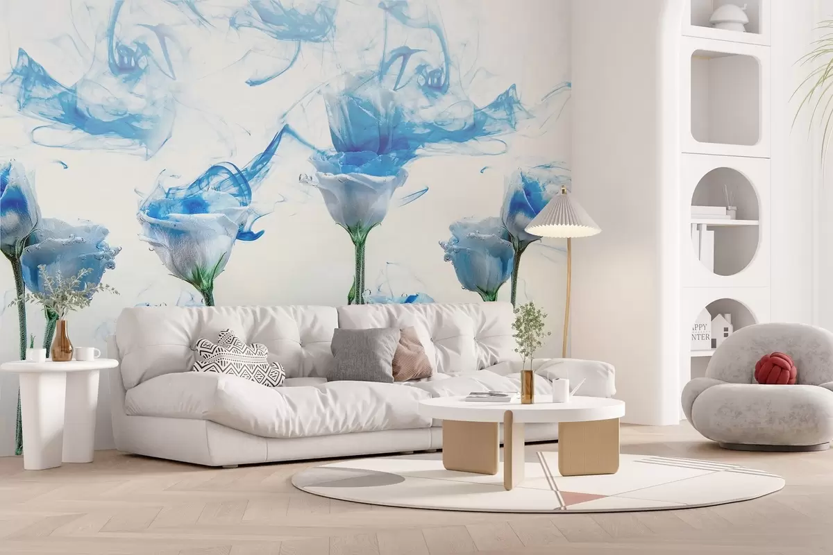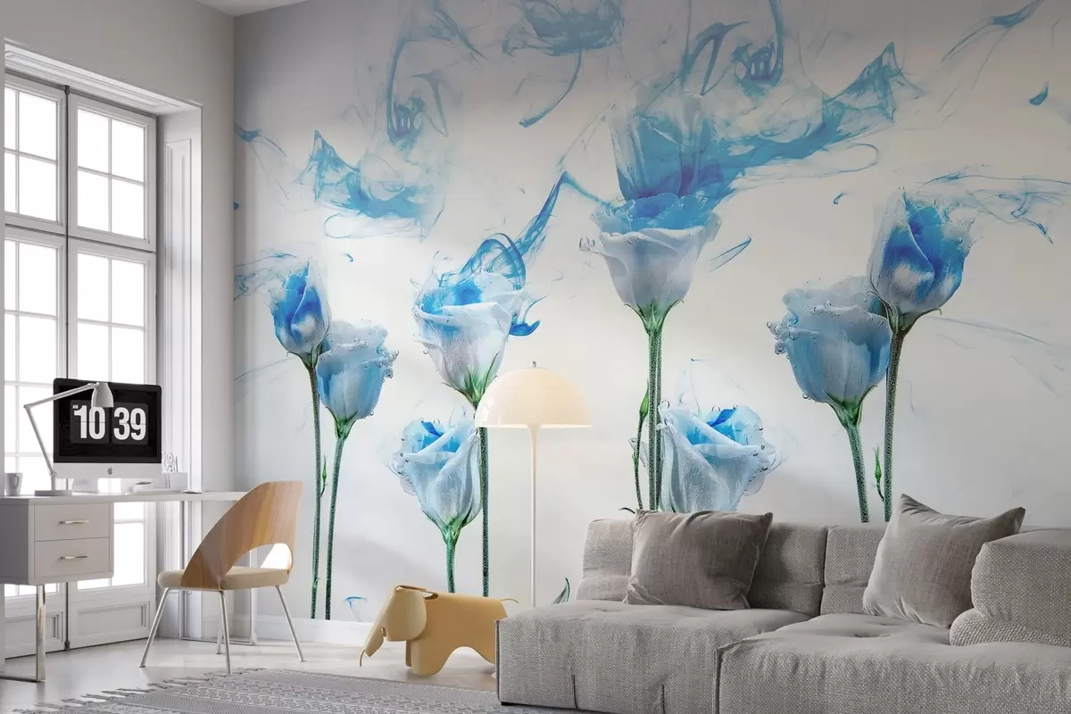 Τοιχογραφίες Λευκά τριαντάφυλλα κάτω από το νερό σε λευκό φόντο με μπλε ακρυλικό χρώμα. Nr. w02139