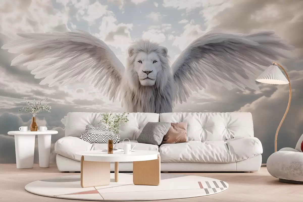 Τοιχογραφίες Μεγαλοπρεπές λευκό λιοντάρι με όμορφη, πλούσια λευκή χαίτη και φτερά ενάντια στον ουρανό σε γκρίζα χρώματα Nr. w02144v1