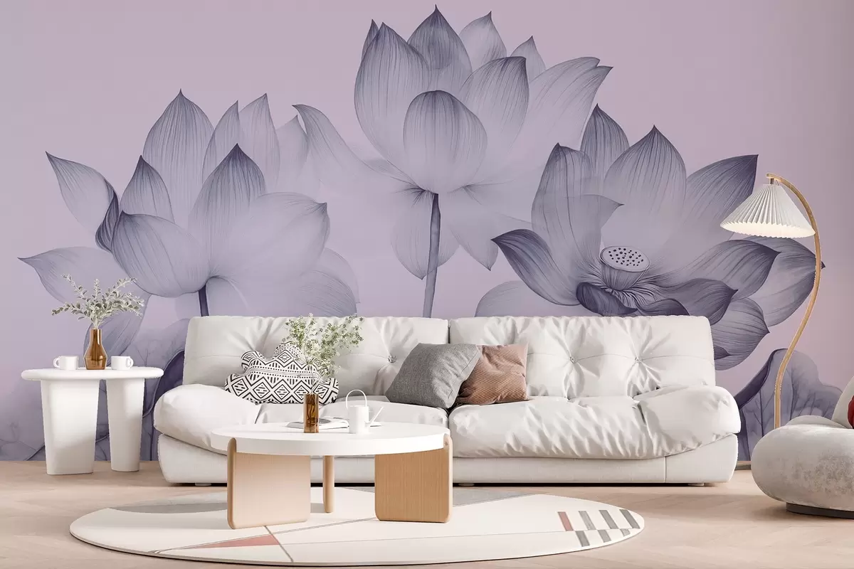 Τοιχογραφίες Τρεις λωτοί με φύλλα σε στυλ κινέζικης ζωγραφικής σε μπλε χρώμα Nr. w02146v2