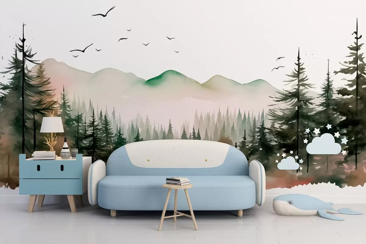 Τοιχογραφίες Ακουαρέλα δάσος και ορεινά τοπία, πράσινα και ροζ χρώματα Nr. w02150v1