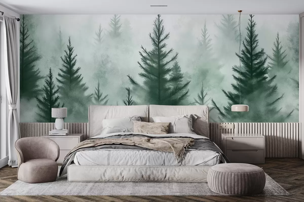 Τοιχογραφίες Δάσος στην ομίχλη, πεύκα, ακουαρέλα, πράσινα χρώματα Nr. w02152v1