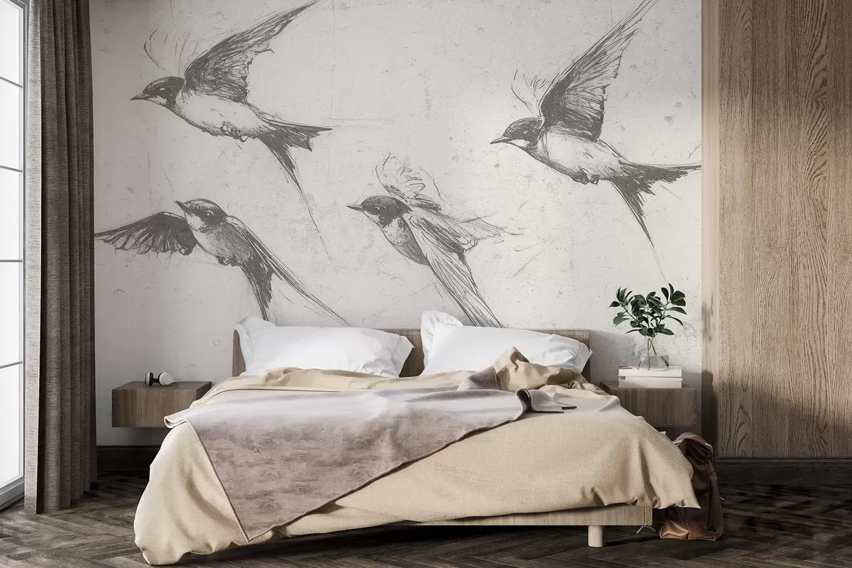 Τοιχογραφίες Ιπτάμενα πουλιά, σχέδιο με μελάνι, μινιμαλισμός, γκρι χρώματα Nr. w02155