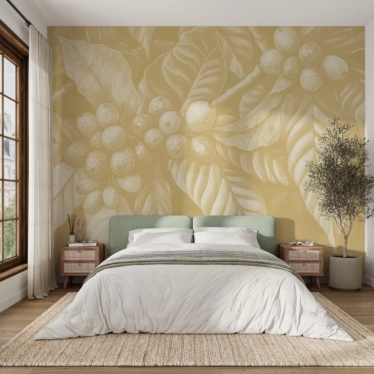Τοιχογραφίες Κλαδιά φυτών καφέ με φρούτα και τροπικά στοιχεία σε μπεζ αποχρώσεις Nr. w02209v1