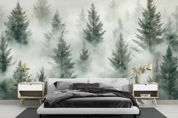 Τοιχογραφίες Όμορφο δάσος με πεύκα, ομίχλη, τοπία της φύσης, πράσινα χρώματα Nr. w02222