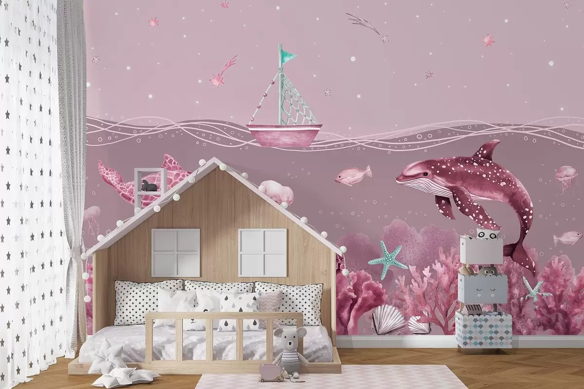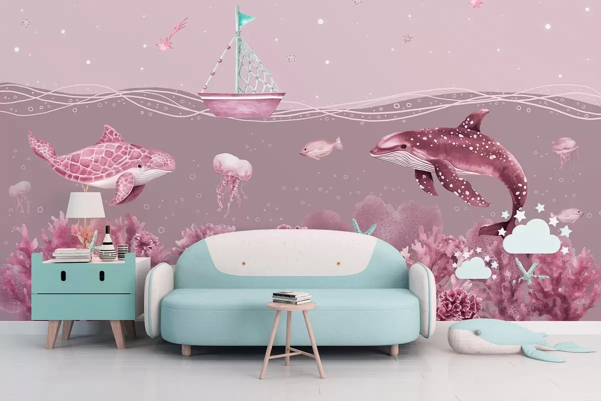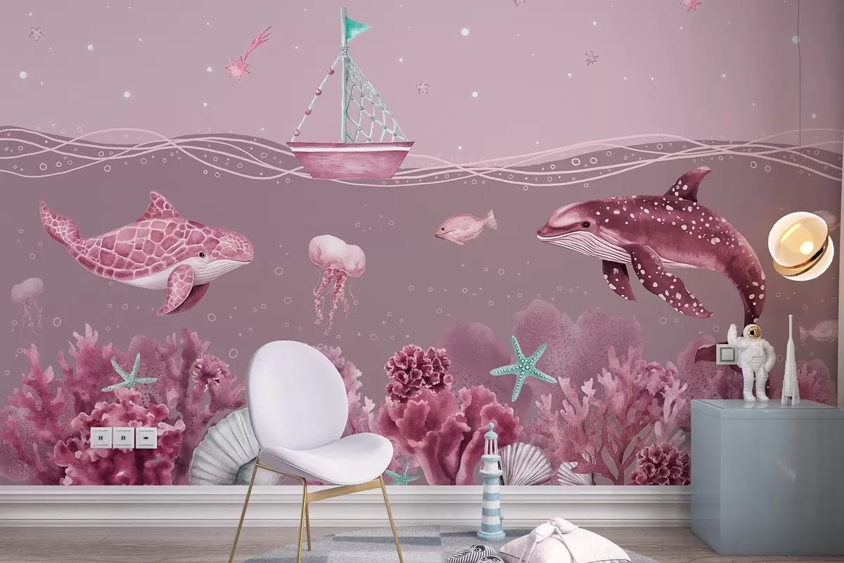 Τοιχογραφίες Θαλάσσια ζωή, στυλ ακουαρέλας, κοράλλια, βάρκα, δελφίνι, μέδουσες, έναστρος ουρανός, ροζ χρώματα Nr. w02310v2