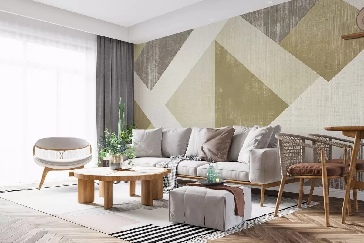Τοιχογραφίες Ένα μοντέρνο γεωμετρικό σχέδιο ταπετσαρίας με επικαλυπτόμενα σχήματα σε απαλές αποχρώσεις του μπεζ, της ελιάς και του ταουπέ. Nr. w02341