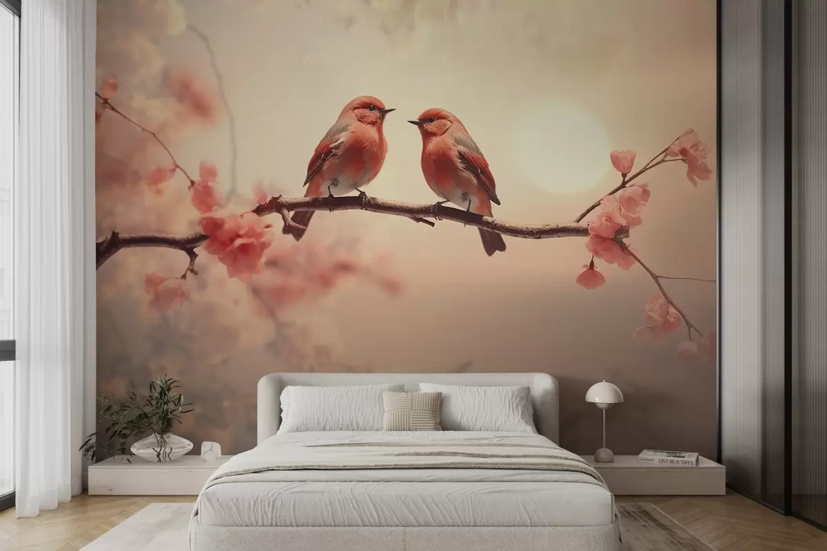 Τοιχογραφίες Μια γαλήνια και ρομαντική σκηνή με δύο μικρά πουλιά που κάθονται σε ένα λεπτό κλαδί διακοσμημένο με απαλό ροζ λουλούδια. Nr. w02343