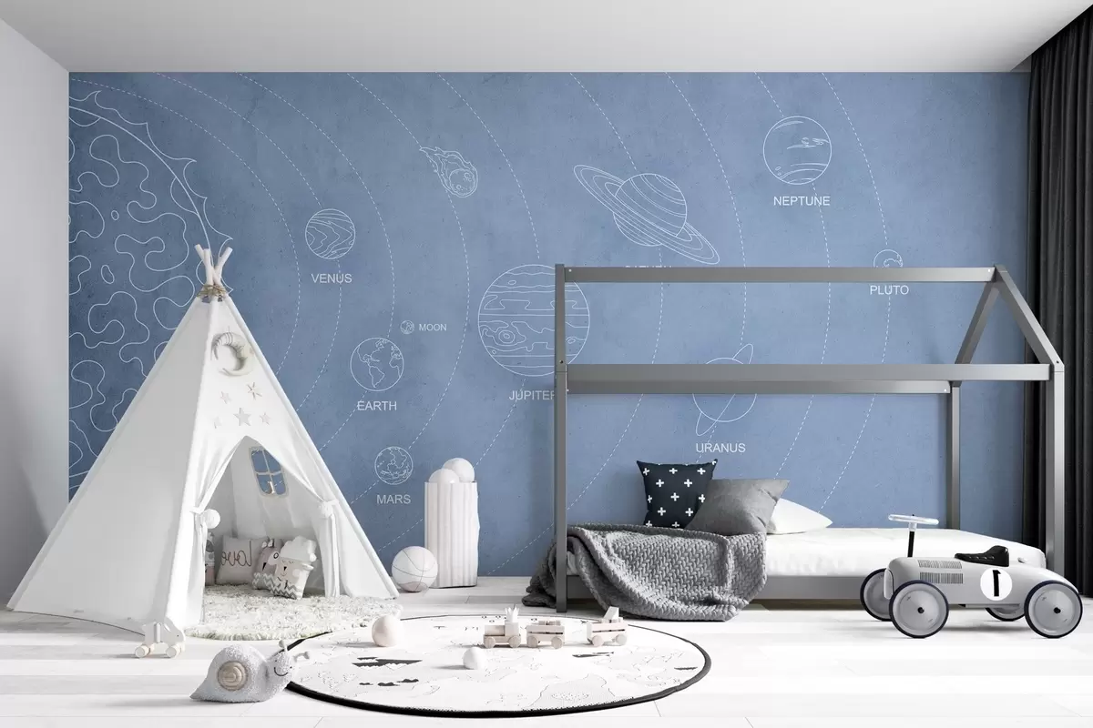 Τοιχογραφίες Ηλιακό σύστημα σε μινιμαλιστικό στυλ σε μπλε φόντο με υφή Nr. w02344v1